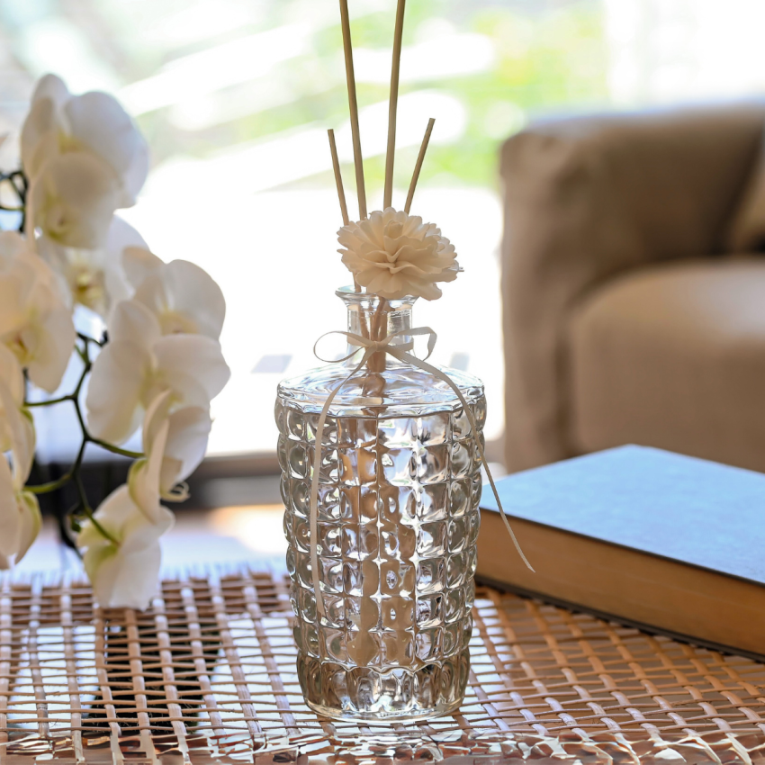 Frasco difusor de vidro reciclável, sem embalagem externa.